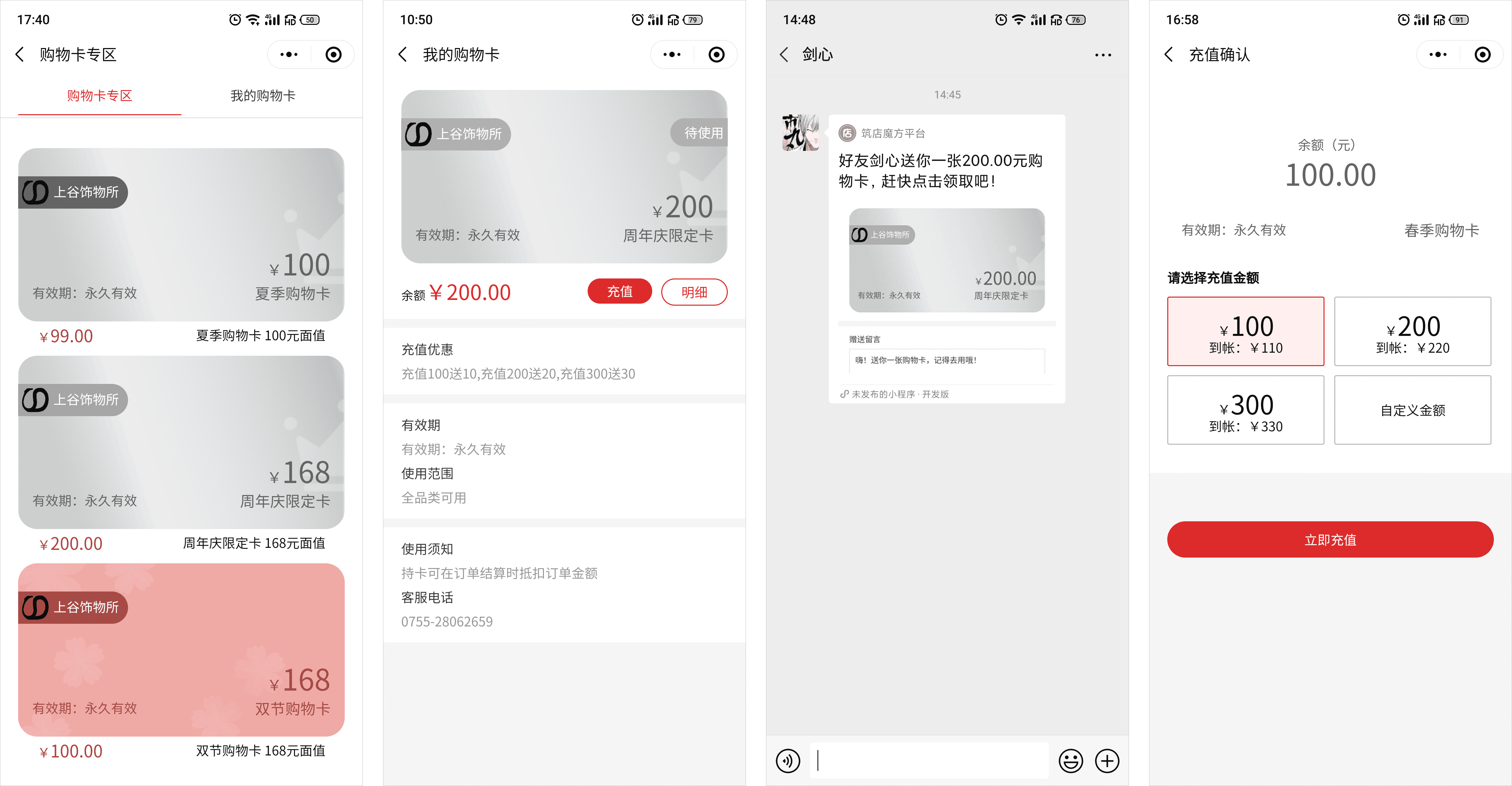 购物卡可作为礼品卡赠送好友,好友注册领卡并在店铺消费