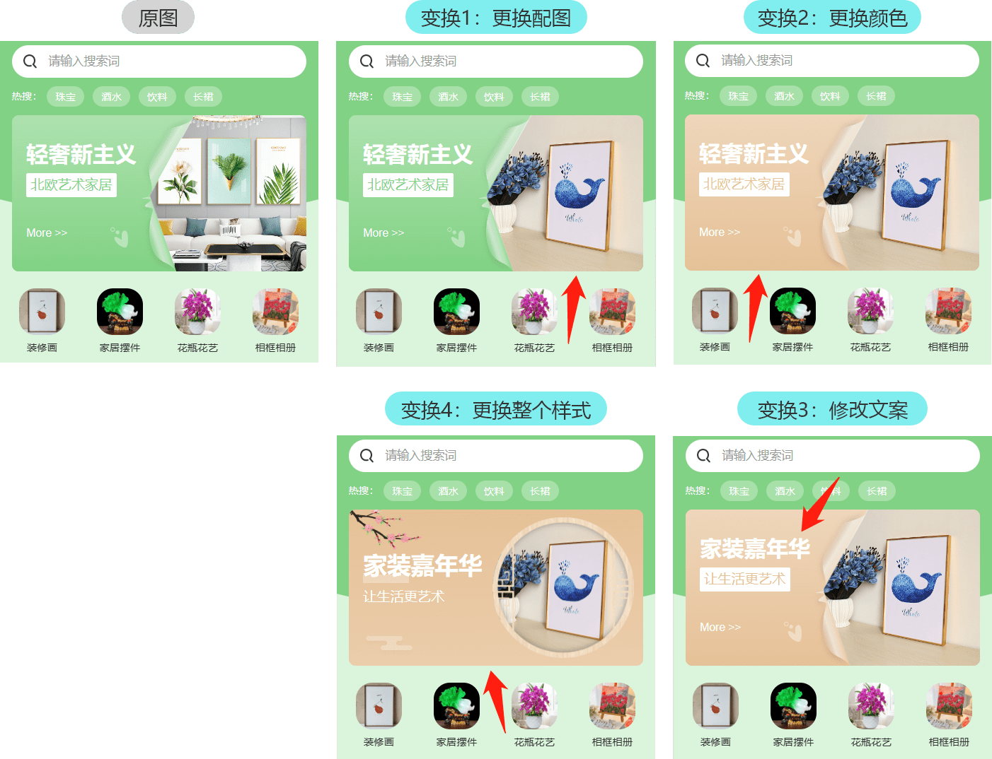不同于其他软件只能整张图片更换的方式。筑店魔方模板中的出现图片属于文案跟配图拼接而成的,所以可以自由更换文案和配图。这样可以让模板内容更契合商家业务,同时也减少商家的装修时间。