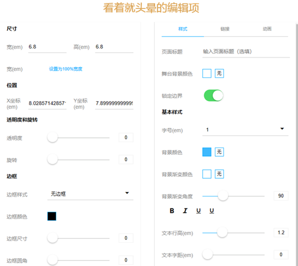 现在主流的可视化编辑功能采用的思路都尽可能多的将编辑项给到用户,让用户自己的编辑。这种将工作抛给用户的方法很粗暴,就是不管这个编辑项适用场景如何,一股脑的都丢给用户。所以这个对于刚接触的用户来说,上手门槛很高,更不要说根据这些操作项编辑出很好看的样式出来。