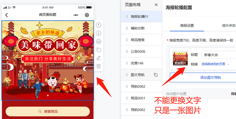 虽然这些系统给到了复杂的操作项了,但当商家需要修改里面的一些文字或配图却发现不支持,因为里面就一张图片,你能做的只有替换图片。你能修改的就是一些长宽、位置、旋转等这些。这些编辑项在实际操作中并没有什么特别的意义,只是因为在实际开发中,这些编辑项都是很简单就能实现的。