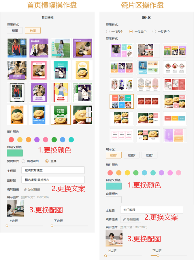 以上这些痛点在【筑店魔方】这里都得到解决。不同于其他系统将大量编辑项抛给客户,让客户自己操作的方式。筑店魔方做的是一个减法,系统预设了很多组件样式供客户选择,然后针对这些样式只保留最常用的几种编辑项,像编辑文案、更换配图和颜色这种。这样既可以降低上手门槛,又能保证装修效果。